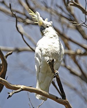 Ein deutscher Motorradfahrer (ich) und mindestens fünfundzwanzig Kakadu (Unfallgegner), welche von links meinen Weg kreuzten (weitere konnte ich, mit verschlossenen Augen in Embryonalhaltung und bei einer gleichzeitigen Vollbremsung, soweit das mit einer vollbeladenen G/S überhaupt geht, nicht zählen) und mir damit meine Vorfahrt nahmen! Schuldfrage geklärt. Wer jetzt glaubt, ach, gar nicht mal so wild. Also, diese Dinger, Namens Gelbhaubenkakadu, (für die Ornithologen unter uns Cacatua galerita) haben eine Körperlänge von bis zu 50cm und bringen dabei zwischen 720g und 1020g auf die Waage. Stellt Euch mal vor bei einer Geschwindigkeit von ca. 60 km/h in einen Schwarm davon zugeraten. 😉 Glücklicherweise gab es keine Toten oder Verletzten. Für weitere Infos zu den Kakadus siehe hier.