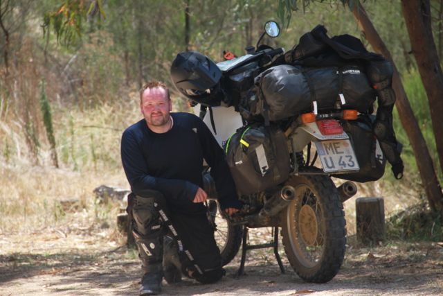 Um diesen sehr schönem Tag noch eine weitere Krone aufzusetzen, hat sich die Farbe der sandigen Piste langsam in rot verwandelt. Ein toller Anblick, gerade in Kombination zu dem saftigem grün der Eukalyptusbäume sowie dem blauen Dunst der Eukalyptusöle am Horizont. Leider erweist sich dieser Sand bei Regen, als sehr ungeeignet zum Bremsen. Und genau, es hat geregnet ;-). In einer steilen Linkskurve hat es mich dann fast zerschellt. Beherzt bin ich auf diese Kurve zugefahren, leicht angebremst um anschliessend souverän die Linkskurve zu Meistern. Weit gefehlt. Statt zu verzögern bin ich über die Piste und in die Kurve, Richtung Abhang gerutscht. Nur ein beherzter Gasstoss, mit ordentlich Druck auf die rechte Fussraste, hat mich zwar rutschend, aber unfallfrei, durch die Kurve geführt. In Zukunft wird bei Regen etwas langsamer und bedachter gefahren. Das Ergebnis dieser Piste und des Regens, ist meine blutig rote Kuh, glücklicherweise von dem roten Sand und nicht von einem erwischten, „Was-Auch-Immer“. Was beim Barry Way aber auch keine Überraschung gewesen wäre.