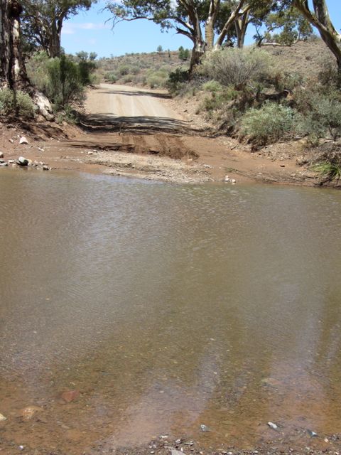 Geröll, Erdreich und Geäst liegen in den Creeks und auf der Strasse. Auf der Piste Richtung Marree und damit zur Hauptstrasse passiert nun das, wovor ich mich die ganze Zeit gefürchtet hatte. Die Strasse ist weggespült und ich habe zwei Möglichkeiten a) entweder alles wieder zurück fahren und damit einen Umweg von ca 280km in Kauf nehmen oder aber b), sich seinem Schicksal ergeben und die ersten Flussdurchfahrten wagen. Ich entscheide mich für Variante b und schaffe meine erste Wasserdurchfahrt.