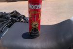 Glücklicherweise bin ich in Australien und damit in einem Land, in dem es tödliche „Multi Insect Killer“ mit „Fast Knockdown“ zu kaufen gibt. Also, nix wie auf zum nächsten Agrarhandel. Nur wie komme ich da hin? Ganz klar, diese Reise steht unter dem Motto „ein Abenteuer mit dem Motorrad“ und dementsprechend fahre ich, auf den Fussrasten stehend und sehr breitbeinig zum Agrarhandel. Vor dem Agrarhandel konnte ich, neben anderen Arten, auch ein Exemplar der Rotrückenspinne an der Gepäckbrücke finden. Leider hat diese sich so schnell verzogen, dass ich das angebliche Wundermittel an einer anderen Spinne, die gerade aus meiner Lenker-Armatur gekrabbelt kam, ausprobieren musste. Kurz drauf gesprüht…Spinnenstarre… nach 4sek springt die Spinne auf, um tod auf dem Rücken zu landen. Das gefällt mir, insbesondere in dieser Situation! Kurzum habe ich in jede Ritze und jedes Loch Mortein gesprüht. Nach der Anwendung war ich mir allerdings nicht mehr sicher, ob Mortein ausschliesslich ein Multi Insect Killer ist, oder noch andere Gattungen, wie z.B. die Art Mensch, killen kann. Nach etwa 24h war die Übelkeit verflogen 😀