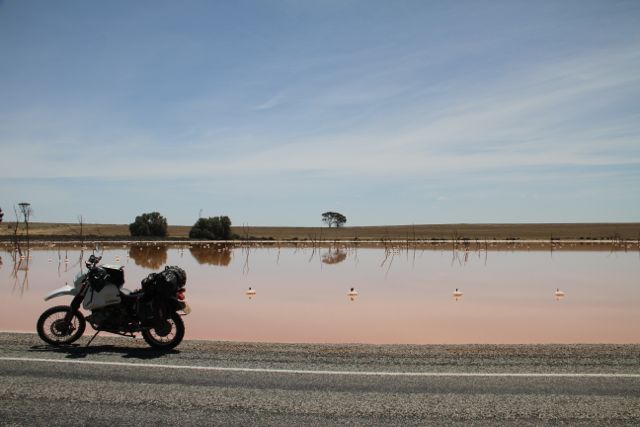 Die Nacht in Southern Cross war relativ unspektakulär. Keine Verkehrsunfälle, keine gröberen Streitigkeiten zwischen Campingnachbarn. Sogar die aufgehende Sonne hat Erbarmen mit mir und gönnt mir Schlaf bis ca. 06:30h. Als ich noch ein wenig schlaftrunken aus meinem Zelt torkel, wundere ich mich über den ungewohnten seidigen Glanz meiner HPN. Bei näherer Betrachtung wird der Grund dafür deutlich. Hier haben ein paar Spinnen ganze Arbeit geleistet. Das Motorrad ist an Lenker, Sitzbank, Seiten und Packtaschen ordentlich eingesponnen. Bei genauerer Betrachtung und Entfernung der Spinnenfäden fällt mir auf, dass diese deutlich härter und dicker sind als die Fäden von mir bekannten Spinnentieren. So ein starkes Spinnennetz hatte ich bisher noch nicht gesehen. Plötzlich erinnere ich mich an ein Gespräch mit einem „Bergmann“ in Leigh Creek. Er hat mich auf die besondere Netzstruktur der Rotrückenspinne (Redbag Spider) hingewiesen. Das was ich hier sehe, erinnert mich doch stark an seine Beschreibungen.  Mit leichter Panik durchsuche ich das Moped nach weiteren bzw. genau so einer Spinne. Eine kann ich sogar finden, und diese hat einen „fucking red“ Strich auf dem Rücken. Habe ich damit etwa eine, vielleicht sogar mehrere Rotrückenspinnen an, auf und wohlmöglich in meinem Moped, kreisch?