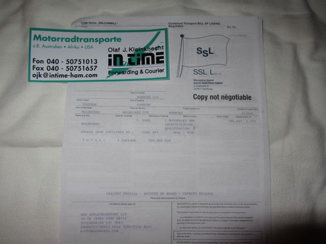 InTime bereitet, über Ihren Agenten in Tullamarine, den temporären Import meines Motorrades vor. Dazu wird bereits im Vorfeld mein Carnet benötigt. Dieses habe ich gestern per Eilbrief nach Melbourne geschickt.