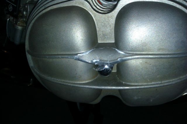 Schnell war klar, dass hier der obere Rahmen der Metallbox deutlich verformt war, der rechte Bereich der Box, in Höhe des rechten Zylinderkopfdeckel, eingerissen, der Boden an verschieden Stellen ausgerissen und diverse Beschädigungen stattgefunden haben müssen.