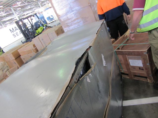 Nach einem Anruft bei meinem Brokerage in Sidney (J.V.C. Logistics PTY LTD – Meinen Dank an Daniel und seinem Vater Simeon für die tolle Unterstützung) habe ich den Warehouse Office um einen Schadensbericht (Damage Report) gebeten. Dieser wurde auf genommen und ich konnte mit der Demontage der Box anfangen. Irgendwie muss ich mich mit meinen Schreiben vor Wut oder Entsetzen etwas zurück nehmen, aber als ich dann auch noch sehen durfte, wie der rechte Zylinderkopfdeckel meines Motorrades beschädigt war und ein Stückblech zwischen Krümmer und Motorschutz klemmte, bin ich fast an die Decke geflogen.