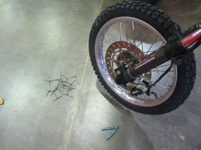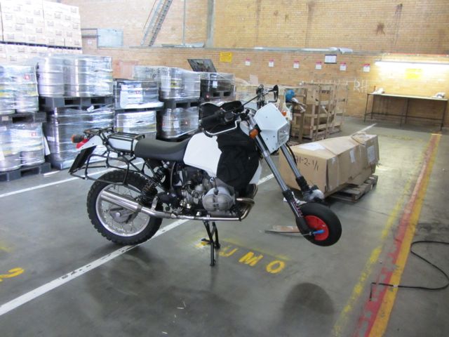 Hier war sofort klar, was fehlt. Auf einem dieser Bleche hatte ich meine Reparaturanleitung und das Werkstatthandbuch der BMW, ebenso wie verschiedenes Werkzeug und die Schrauben zur Befestigung meiner vorderen Bremse in einer Tasche fixiert. Naja, da dieses Blech nicht mehr vorhanden war, fehlte leider auch der Rest. Da ich aber keine Lust auf weitere Verzögerungen und irgendwelche Diskussionen bzgl. der Fahrsicherheit meines Motorrades hatte, habe ich die Bremse einfach mit Kabelbinder gesichert und mit zwei Alibi Schrauben versehen. So bin ich nach Freigabe und 8h später, vom Hof gefahren. Da es gar nicht mal so einfach ist, die vordere Bremse nicht zu betätigen, habe ich diese anschliessend einfach nach oben gedreht und mit Kabelbinder am Holm fixiert. Mit dieser Konstruktion bin ich dann selbstbewusst und Grüssend an jeder Polizeistreife vorbeigefahren. Was sollte ich auch sonst machen. Habe ich Euch eigentlich schon erzählt dass ich Kabelbinder liebe?