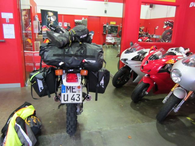 Als ich anschliessend auch noch vom Warehouse Officer darauf hingewiesen wurde, dass er auch noch Geld für das Abheben des Deckels meiner Box verlangen könnte (25 Sek Arbeit), habe ich die restliche Demontage, mit einer ordentlichen Portion Wut im Magen, alleine hinbekommen. Einzig das Schieben des Mopeds aus den Radmulden, hat dann doch etwas mehr Kraft als Wut gekostet. Hat aber geklappt und die Wut war verflogen 😉